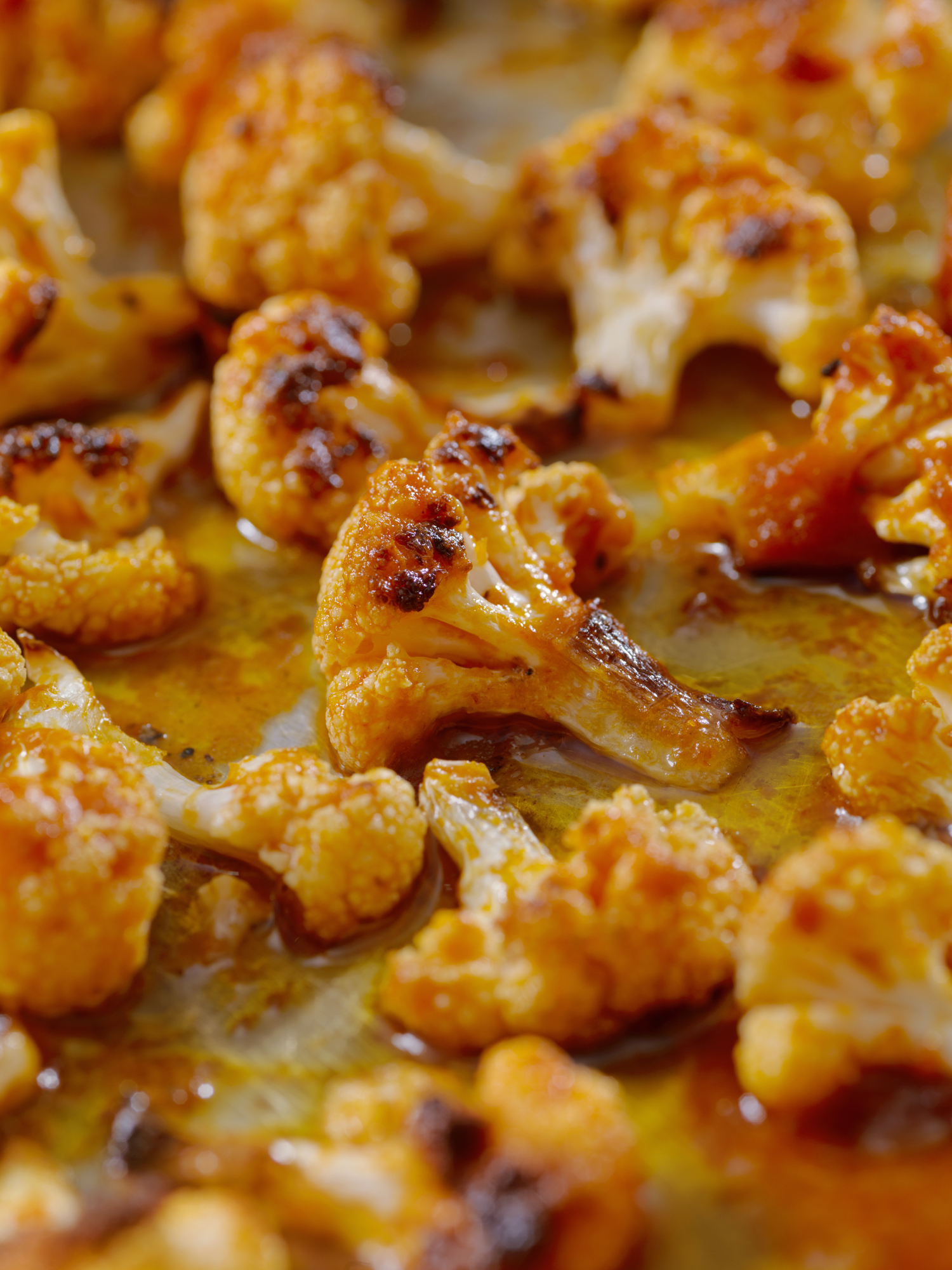 - Pull out cauliflower (should be browned), dip in buffalo sauce, place back on baking sheet on top rack for 8 more minutes