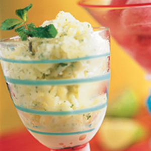 1. Set aside 3 pineapple chunks for garnish. Place remaining pineapple and juice into an 8-inch square pan. Cover and freeze 1 1/2 to 2 hours or until almost frozen.