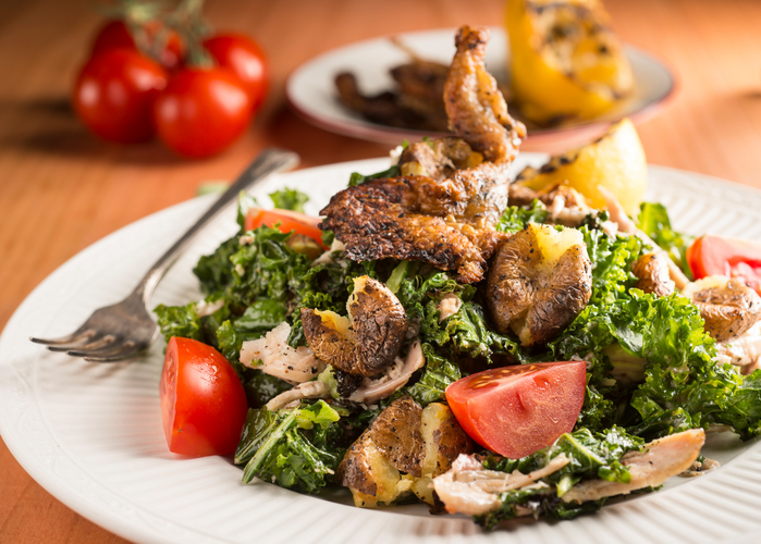 - Toss the kale with the lime dressing. Add the shredded chicken, beans, tomatoes, and scallions; toss again. Add the cheese and toss lightly to finish.