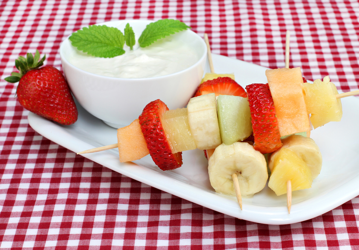 - Thread fruit alternately onto each wooden skewer. Serve skewers with dip.